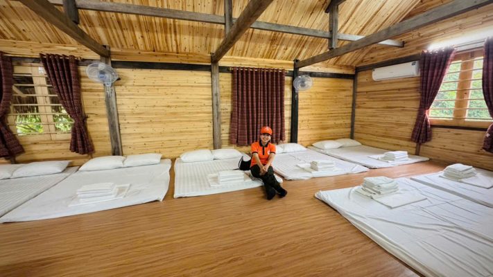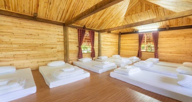 Với khu nhà sàn gỗ mái lá, sàn lót sạch, xung quanh không gian mát thoáng, được trang bị quạt và điều hòa để linh hoạt cho các mục đích sử dụng, mỗi bạn có đệm trải sàn và khăn riêng. Đây thực sự là một không gian cộng đồng thuận lợi cho các hoạt động kết nối và tăng kỹ năng giao tiếp cho các con. Khu ở được tách riêng khu nam, khu nữ và có giáo viên đồng hành từng khu vực với các con.