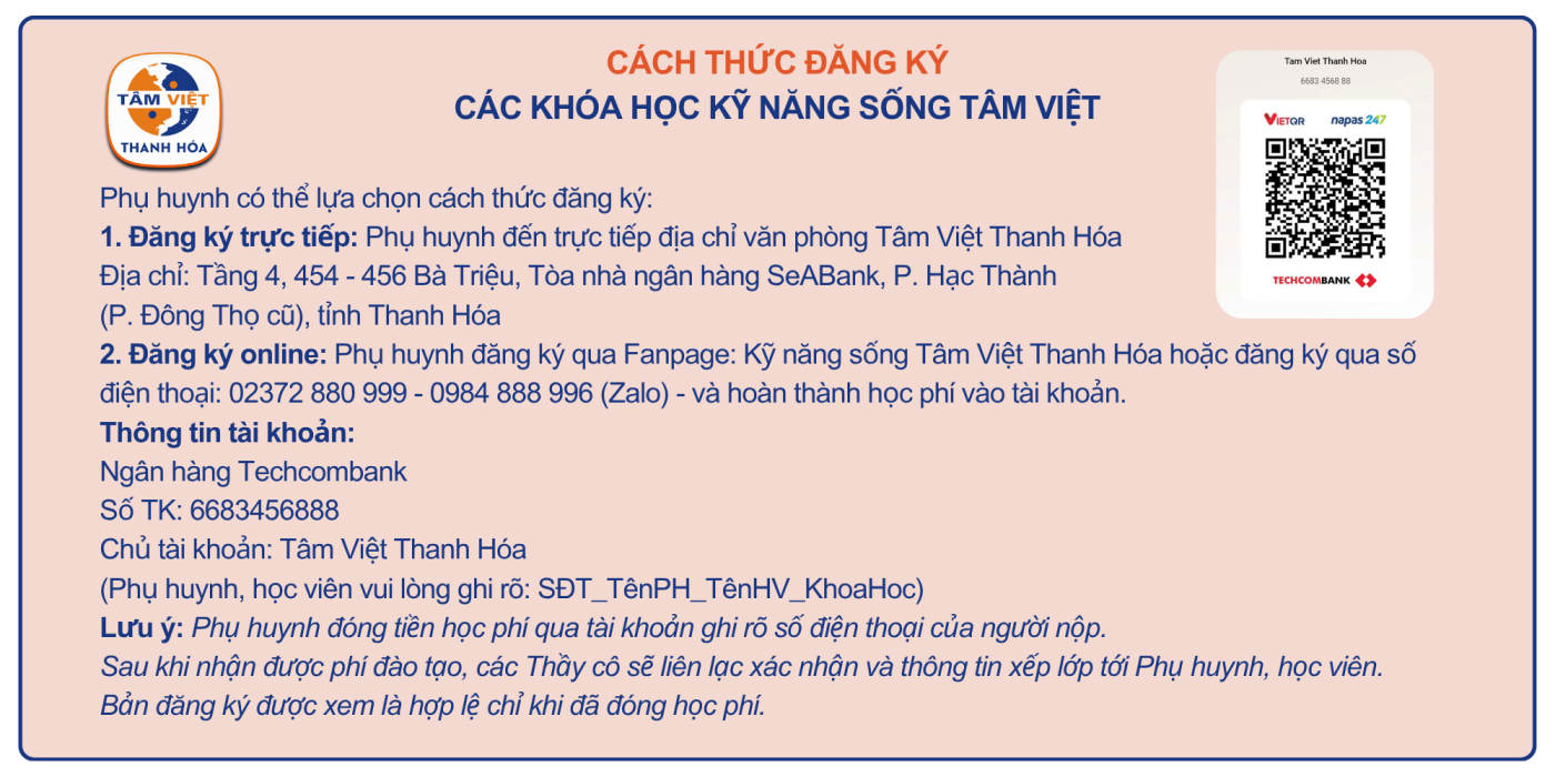 Điện thoại: 02372 880 999 (VP) – 0984 888 996 (Cô Huế) – 0985 096 000 (Zalo Kỹ năng sống)