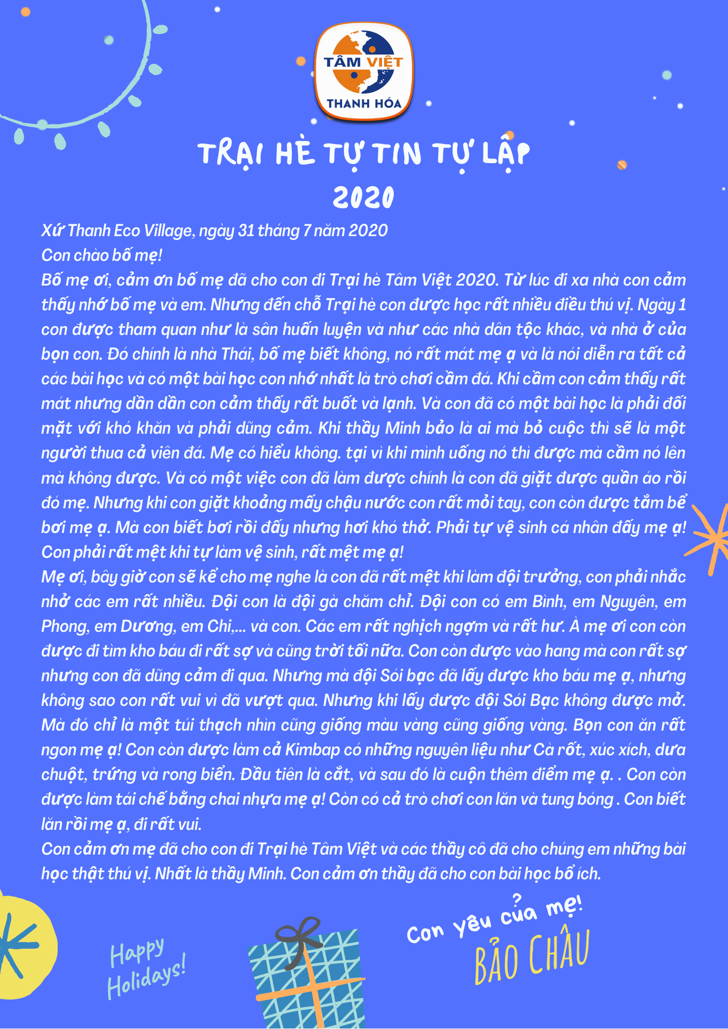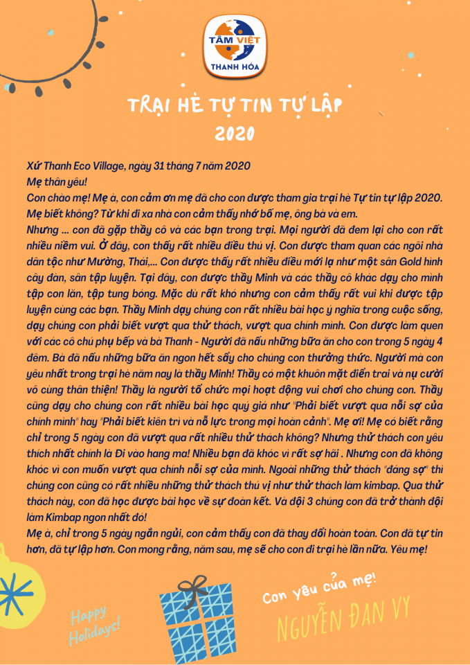 Thấu hiểu sâu sắc mối bận tâm đó, mùa hè năm nay, Tâm Việt Thanh Hóa tiếp tục triển khai chương trình: TRẠI HÈ TỰ TIN – TỰ LẬP (TRẠI HÈ NỘI TRÚ 6 NGÀY 5 ĐÊM) dành cho các em học sinh 8-13 tuổi với chuỗi những hoạt động huấn luyện nhằm rèn rũa, hình thành ý thức tự giác, sự tự tin vào bản thân cho các em học sinh