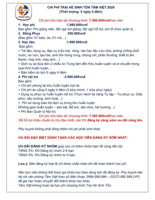 ĐĂNG KÝ NGAY : TRẠI HÈ SINH TỒN TÂM VIỆT (9-15 tuổi) : Đăng ký Trại hè Tâm Việt